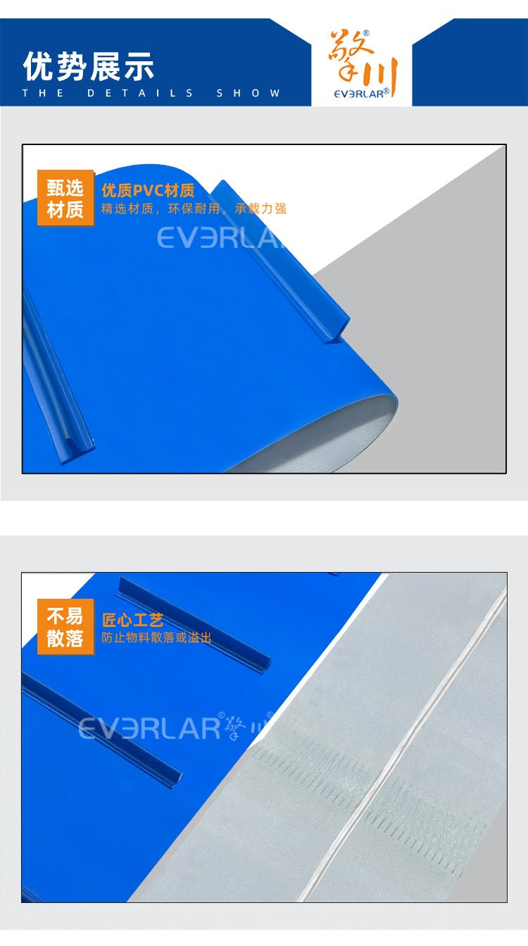 產(chǎn)品名稱:藍(lán)色PVC輸送帶加擋板導(dǎo)條耐磨防跑偏防掉落自動(dòng)化生產(chǎn)線物料傳送工業(yè)皮帶